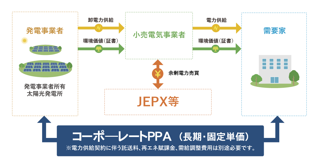 コーポレートPPAとは、発電事業者と需要家との電力購入契約のことで、需要家が発電事業者と直接長期契約を結び、新設した太陽光発電設備で発電された再エネ電力を長期・固定単価で調達する方法です。