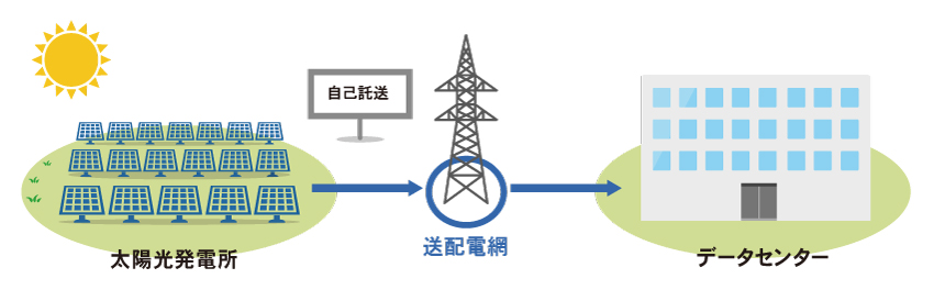 データセンターに再エネ電力を調達したいが、太陽光発電設備の設置が難しい塩害地域や設置スペースがない場合でも、送配電事業者の送配電設備を利用することで遠隔地の太陽光発電設備で発電した電気を自社施設または自社グループの施設へ送電し、再エネ電力の利用が可能になります。