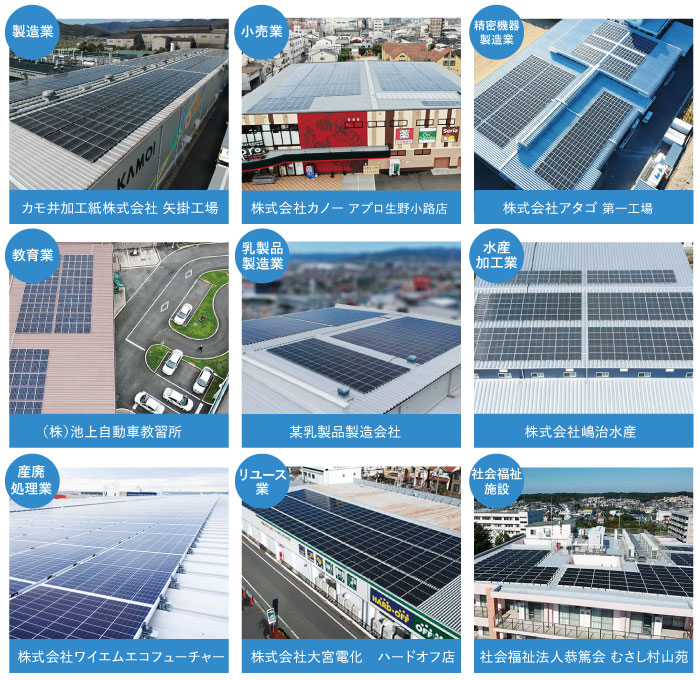 主な設置場所:工場・物流倉庫・病院・介護施設・スーパーマーケットなどの屋根や敷地内