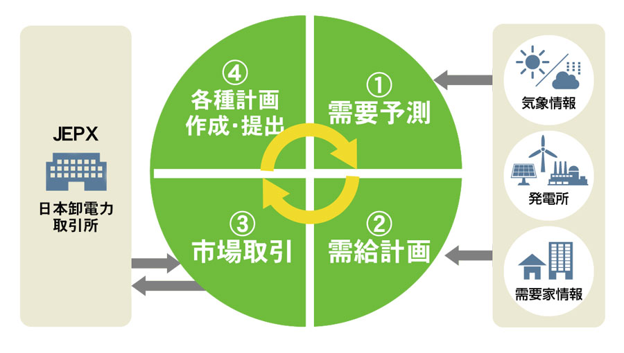 当社の需給管理サービスなら電力の需給管理に必要な「①需要予測」「②需給計画」「③市場取引」「④各種計画作成・提出」の全てをお任せいただけます。