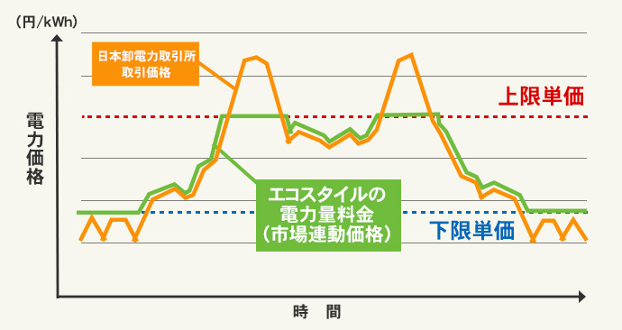 市場連動の場合、市場価格の限度額(上限・下限)が適用されるのは「電力量料金」のみとなります。市場価格に対して限度額単価の範囲で変動した金額に手数料が加算されます。限度額単価を設けることで、突発的な電力高騰などの事態にも柔軟に対応可能な卸電力供給が可能です。