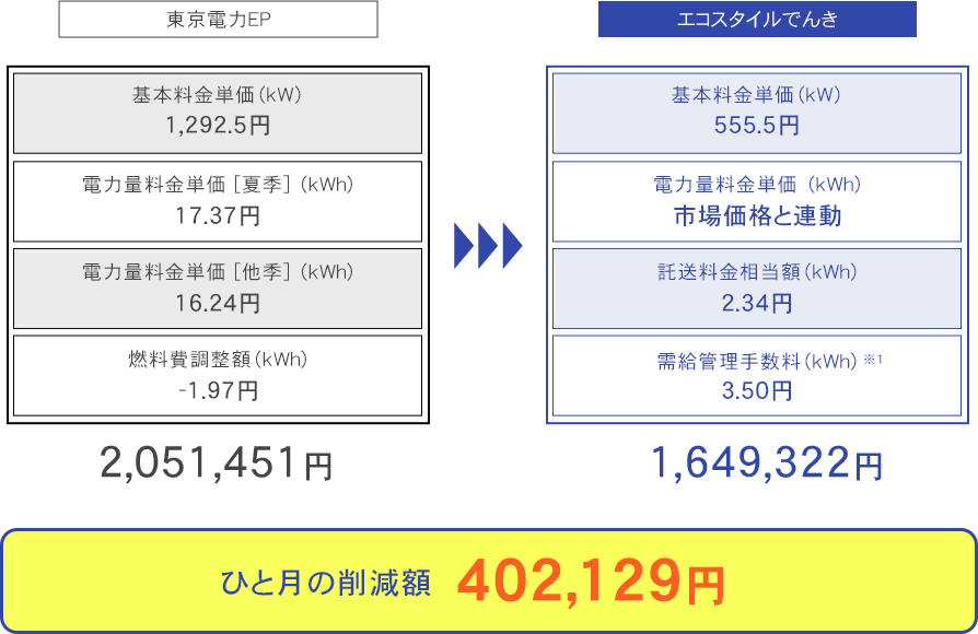 ※ 金額はすべて税込みです。※ 上記試算は一例です。お客様のご契約状況や電気のご利用状況、契約時期などによって、各種契約単価や削減額は異なります。※ 上記試算は2020年5月の実績数値を基に算出しております。(電力量料金単価は[他季]で計算)